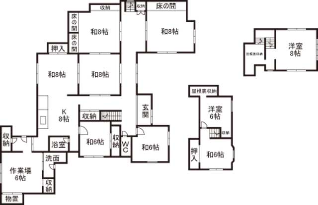 | 間 取 | 9DK+S | 間取内訳 | 1階:和室8帖×4、和室6帖×2、作業場約6帖、ダイニングキッチン、浴室、洗面、トイレ 2階:洋室8帖、洋室6帖、和室6帖、屋根裏収納 |
