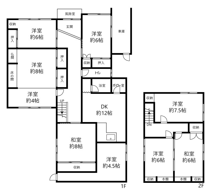 | 間 取 | 9DK | 間取内訳 | 洋室8帖、洋室7.5帖、洋室6帖、洋室6帖、洋室4.5帖、洋室4帖、和室8帖、和室6帖、DK12帖 |