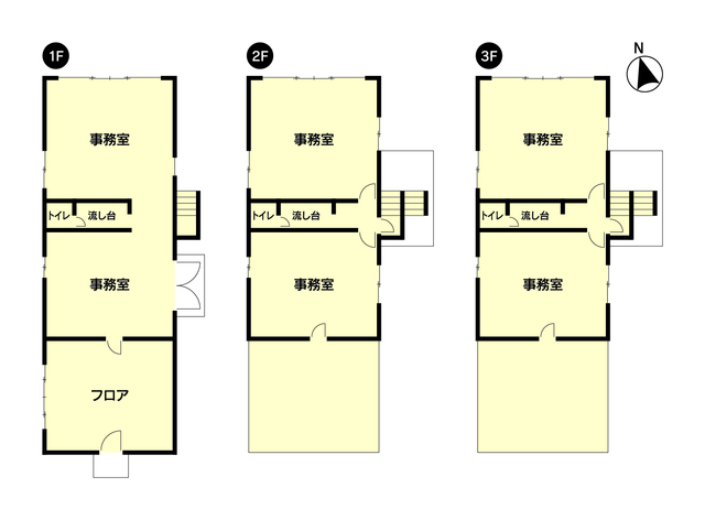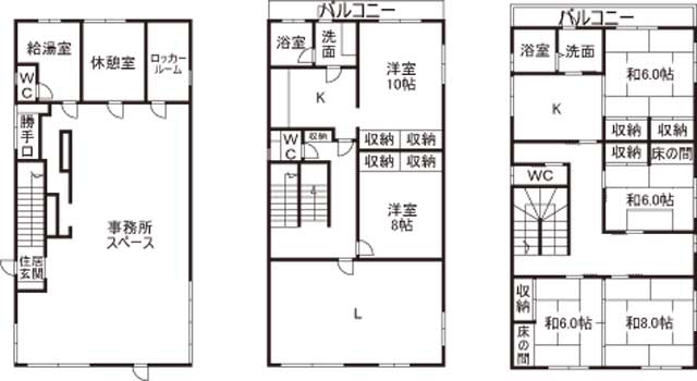 | 物件種別 | その他 | 間取内訳 | 1階:事務所スペース、休憩室、ロッカー室、給湯室、トイレ 2階:リビング、洋室10帖、洋室8帖、キッチン、ユニットバス、洗面所、トイレ 3階:和室8帖×2、和室6帖×2、キッチン、浴室、洗面所、トイレ、ベランダ |